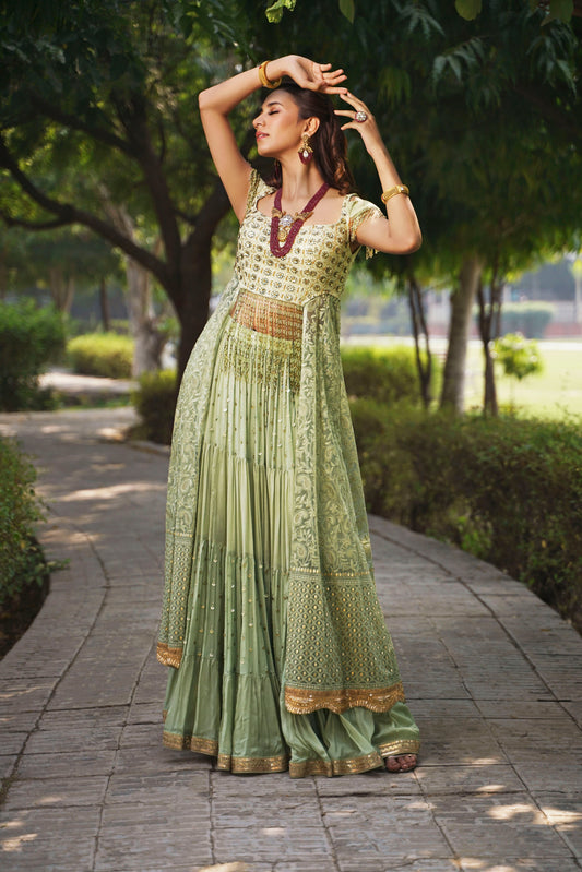 Off-Shoulder Peplum Top with Embroidered Straight Lehenga