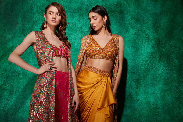 A style that suits all body-types, a ruffle-drape skirt paired with an intricately embroidered blouse and the look is completed with a full-length cape in multi-colored cape.