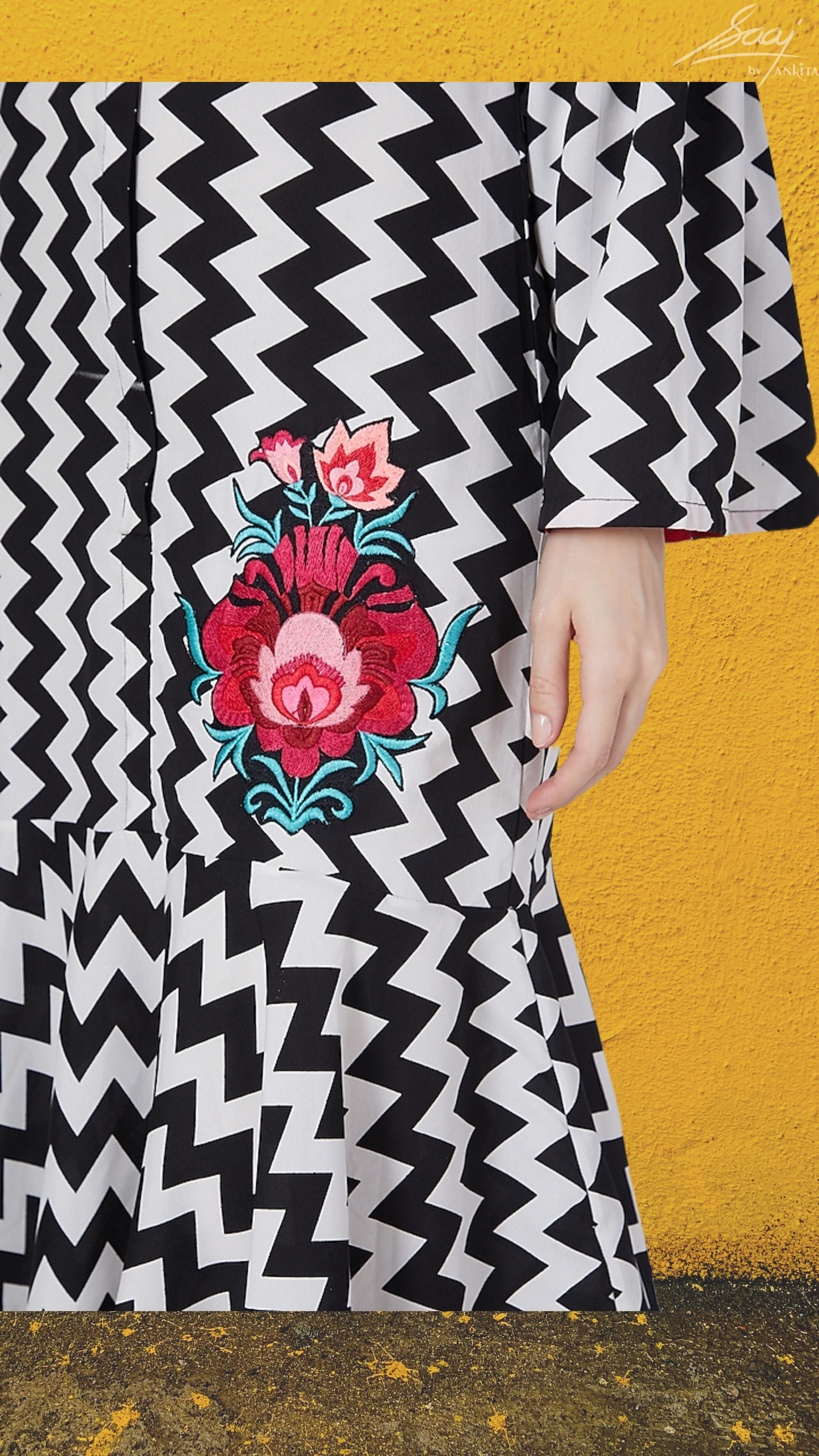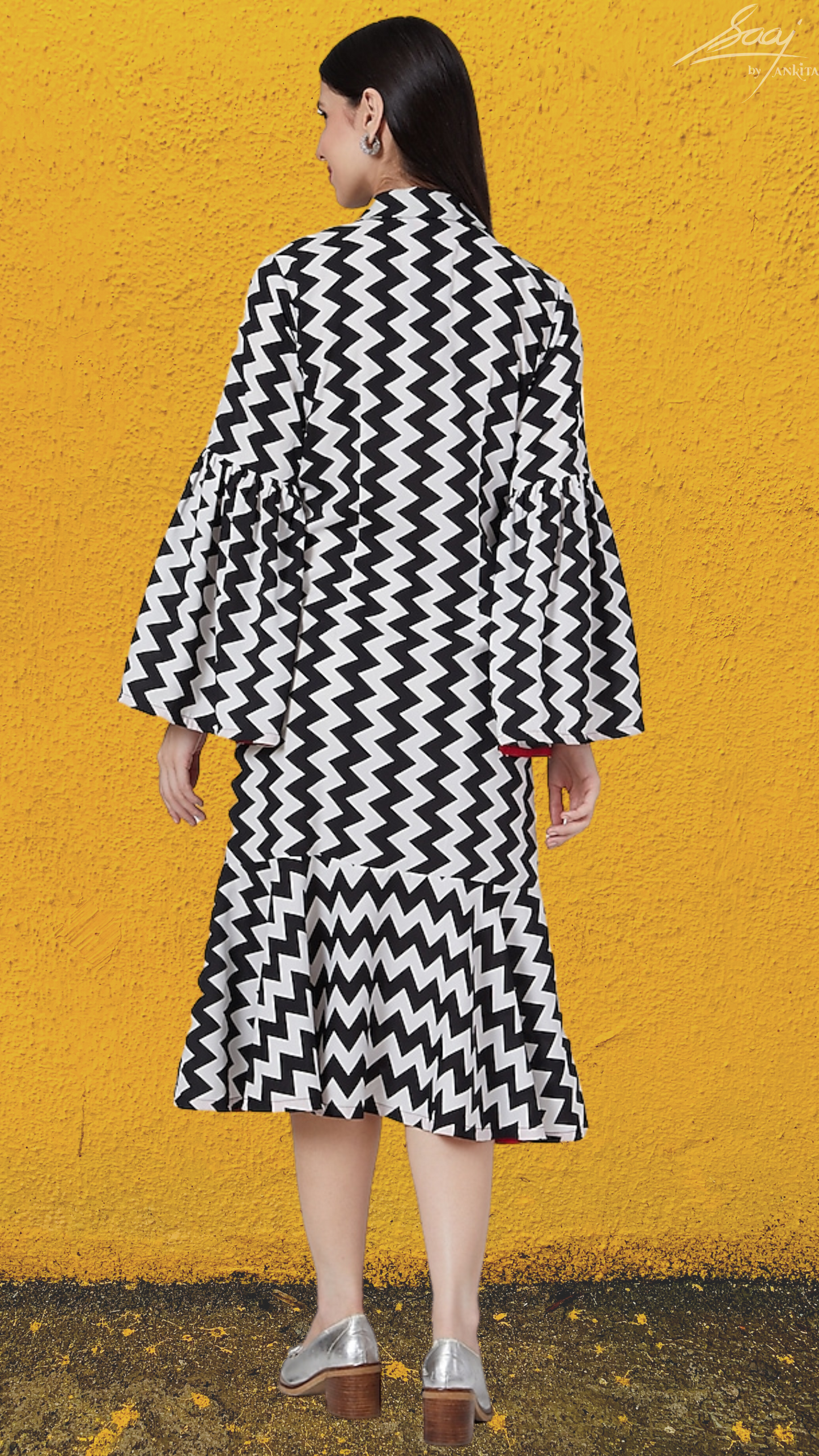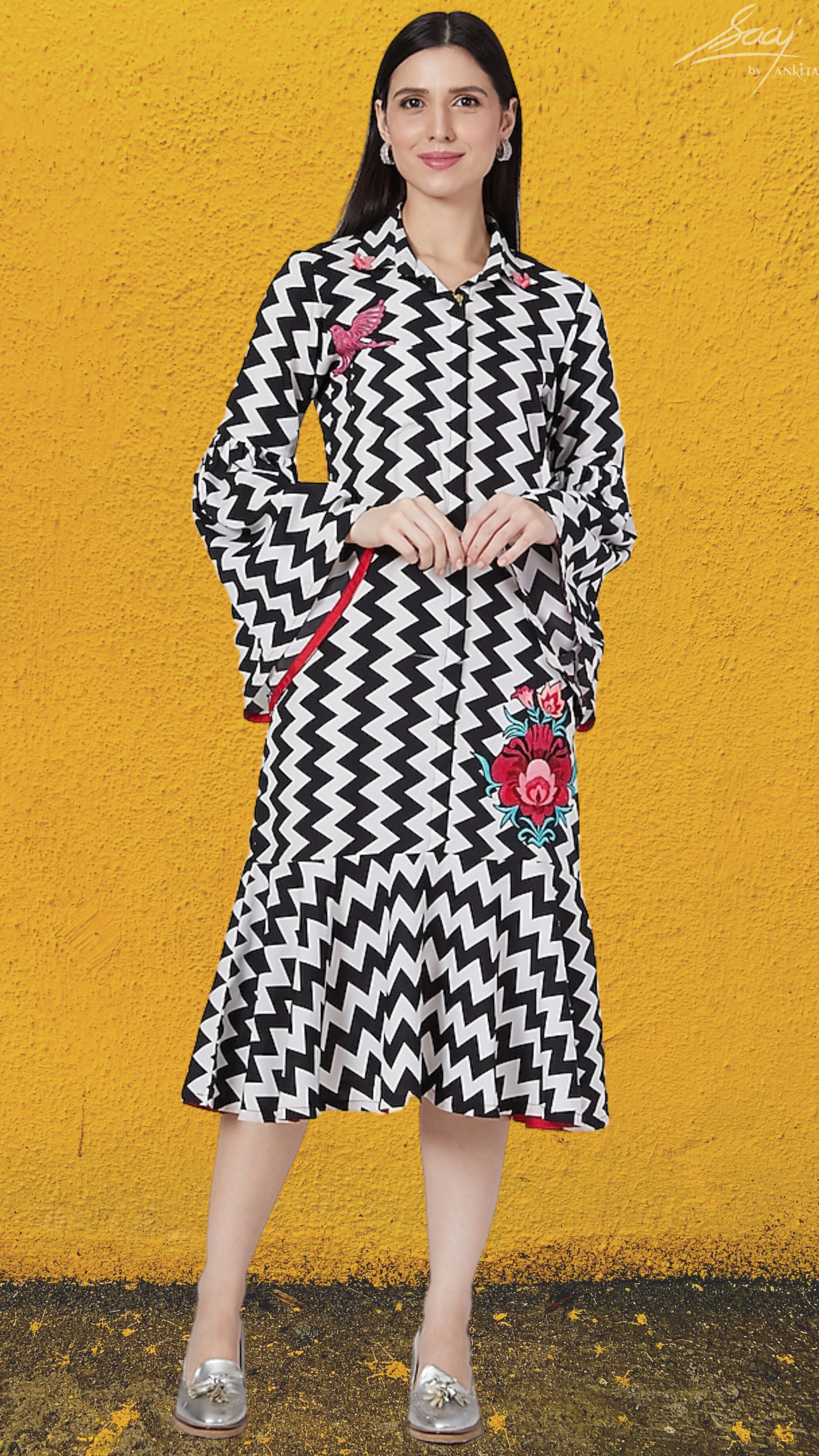 Bold chevron printed crepe shirt dress, with front zip closure and trumpet sleeve details. Made in a relaxed fit, it is a must-have dress in your wardrobe.