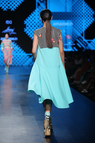 The funky Yak (mountain cow) motif is done in a surreal colour pallet using traditional Indian embroidery techniques. The dress has a cool asymmetrical hem-line with a modern cut.