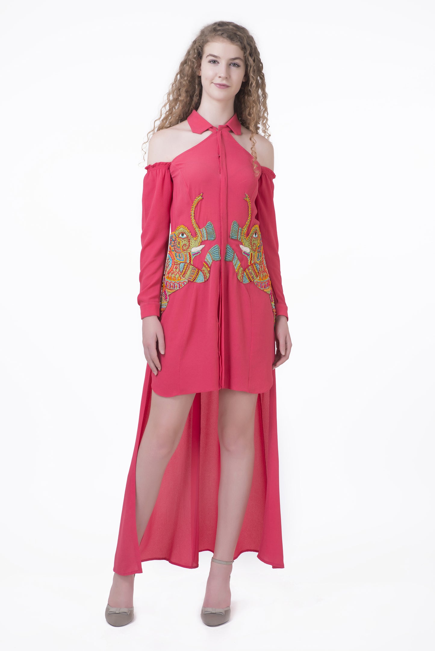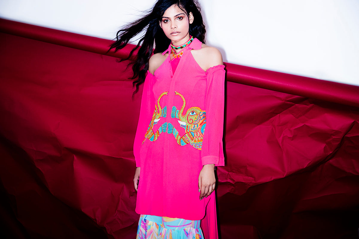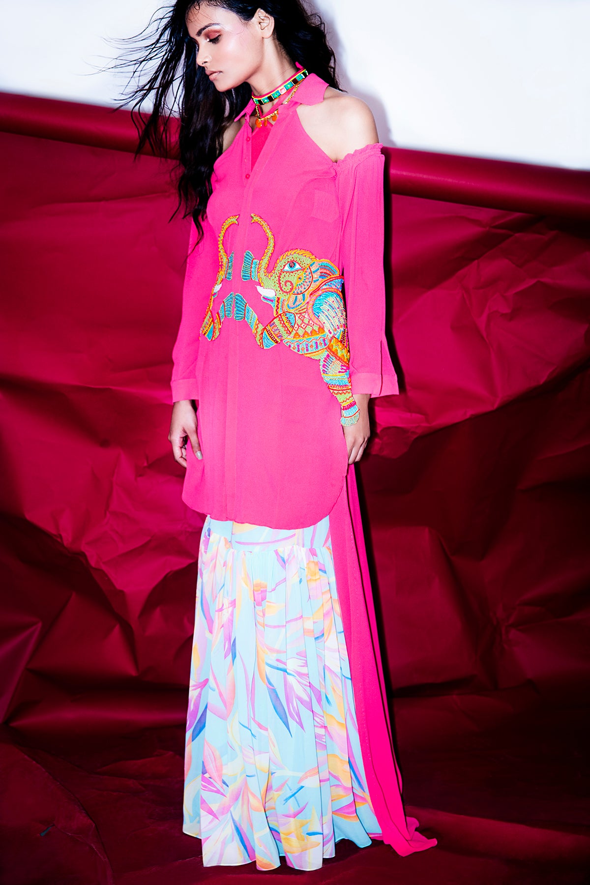 High-low georgette shirt with elephant motif embroidered on both sides with beads, threads and new-age techniques.