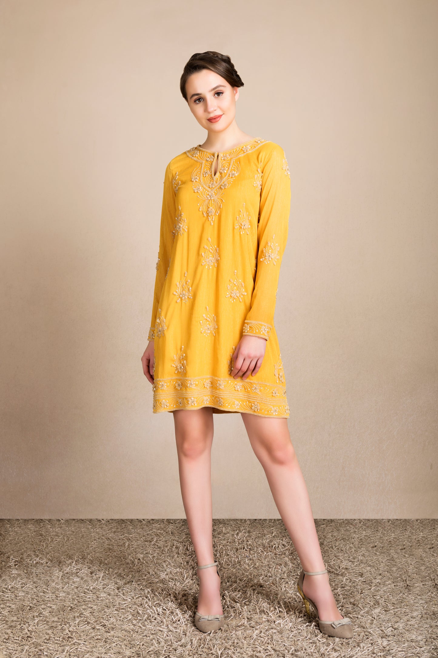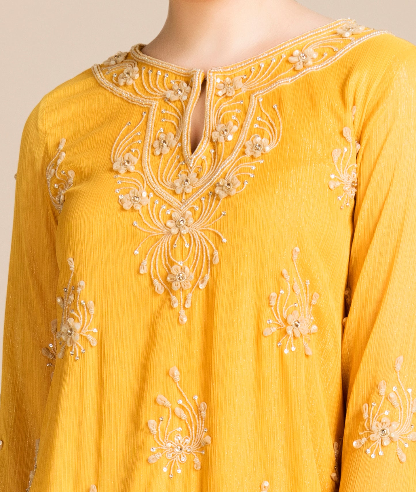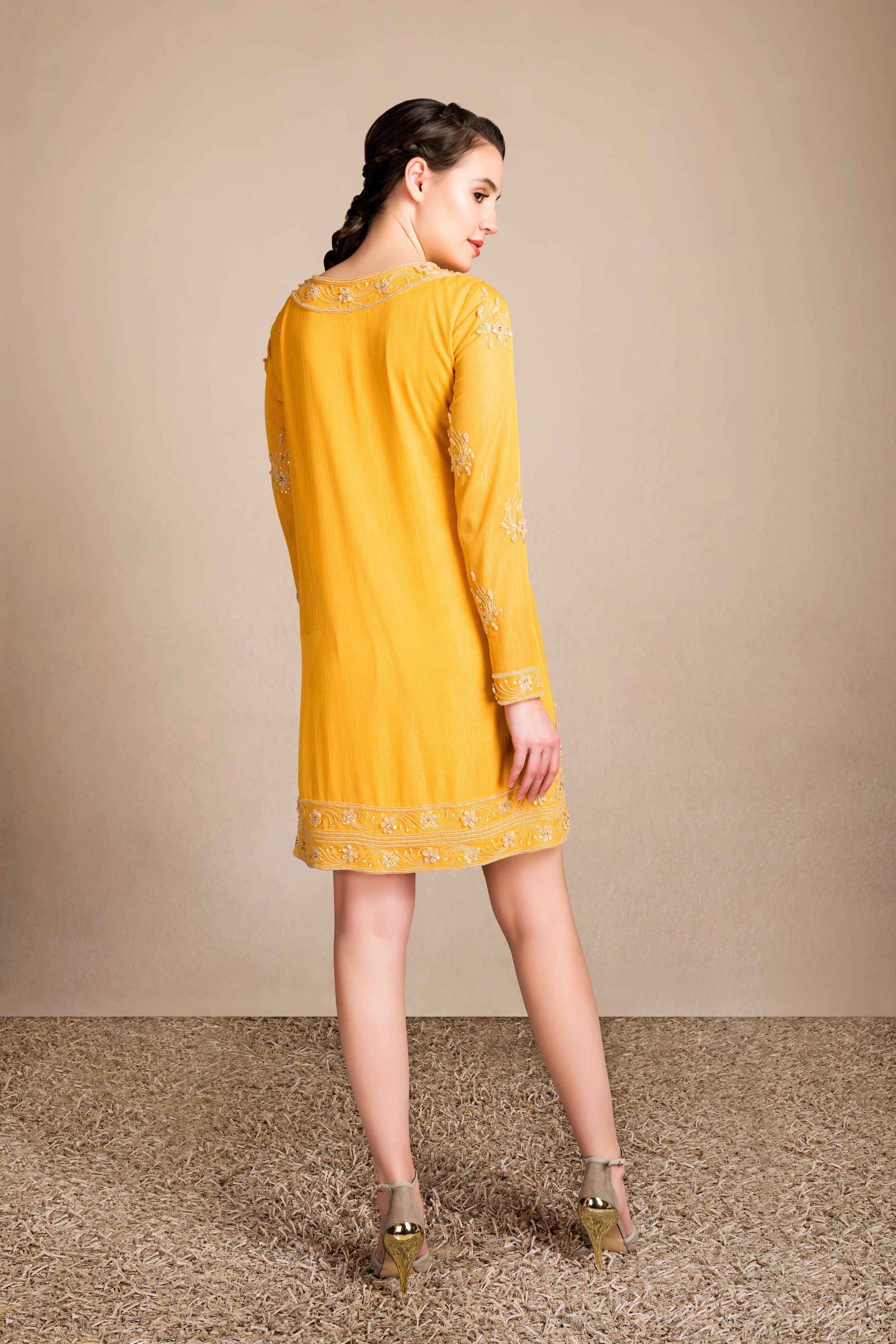 A classic kurta-dress in luxurious metallic georgette with intricate 3D-petal embroidery. Can be worn as a dress by itself, or even teamed with a sharara for a more festive look.