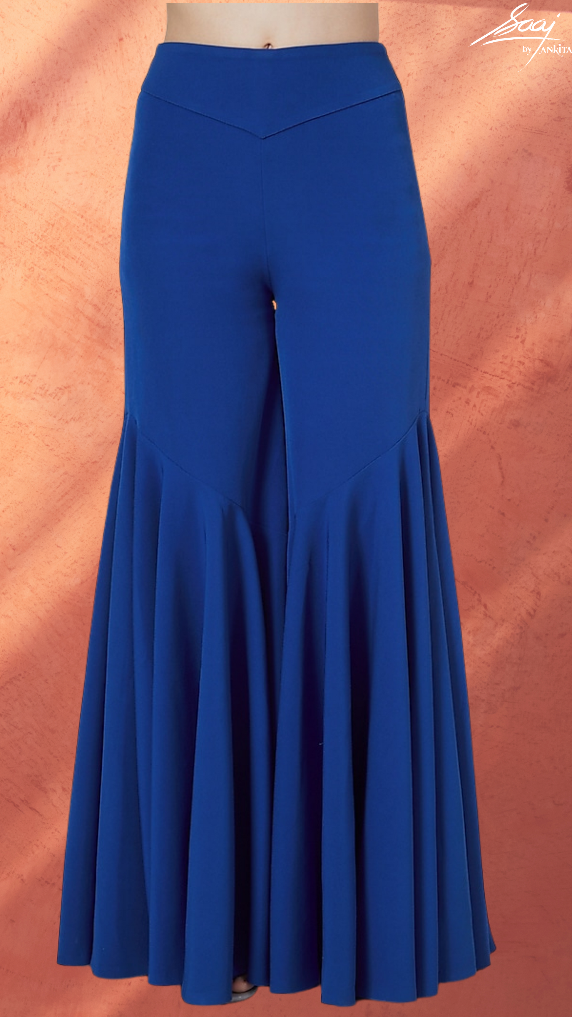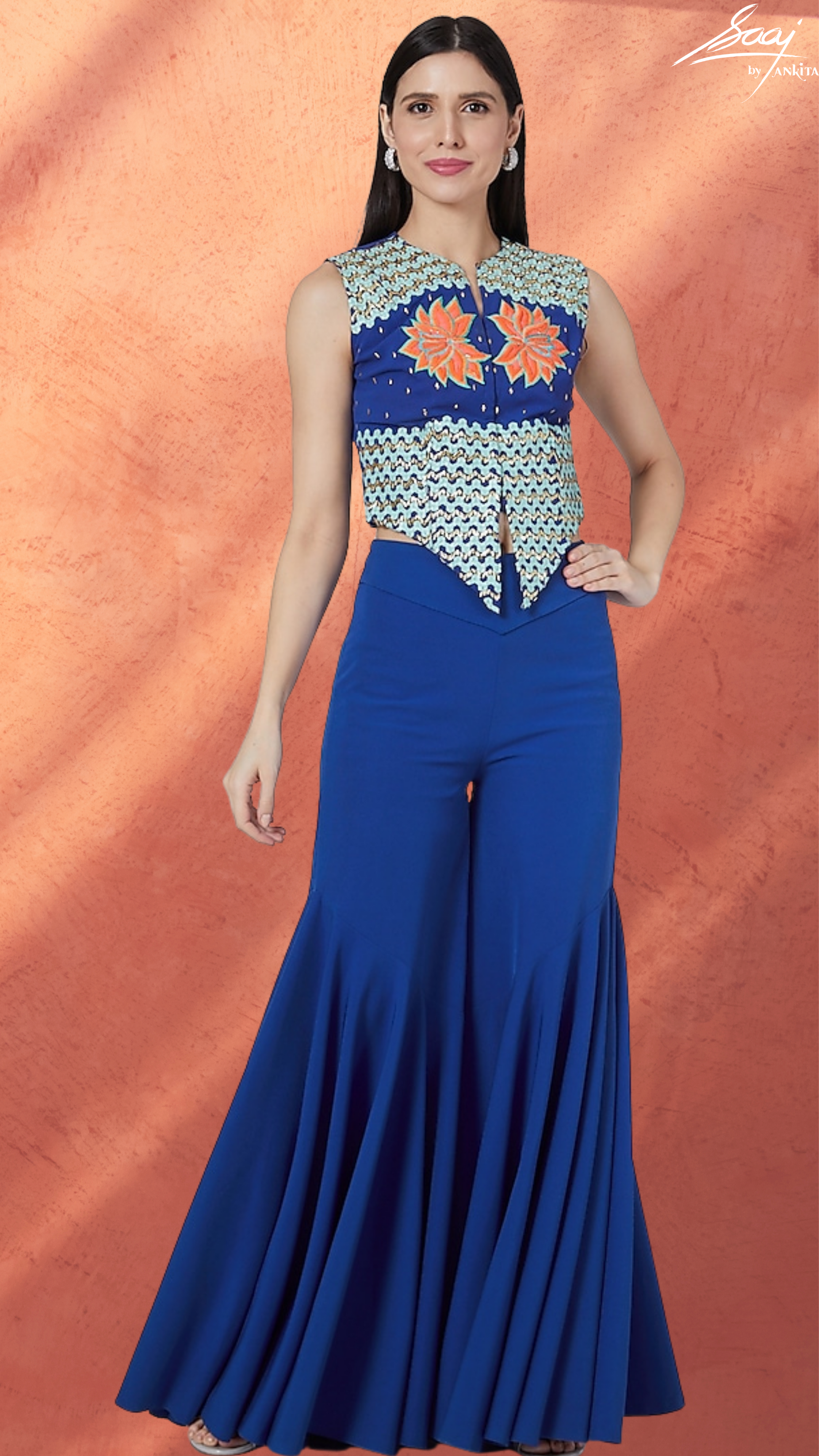 The jacket top is embroidered with neon coloured lotus motifs and the jacket has a cut that is sure to flatter the body by making it look curvier. It is teamed with flair pants in heavy crepe with a flair hem cut.