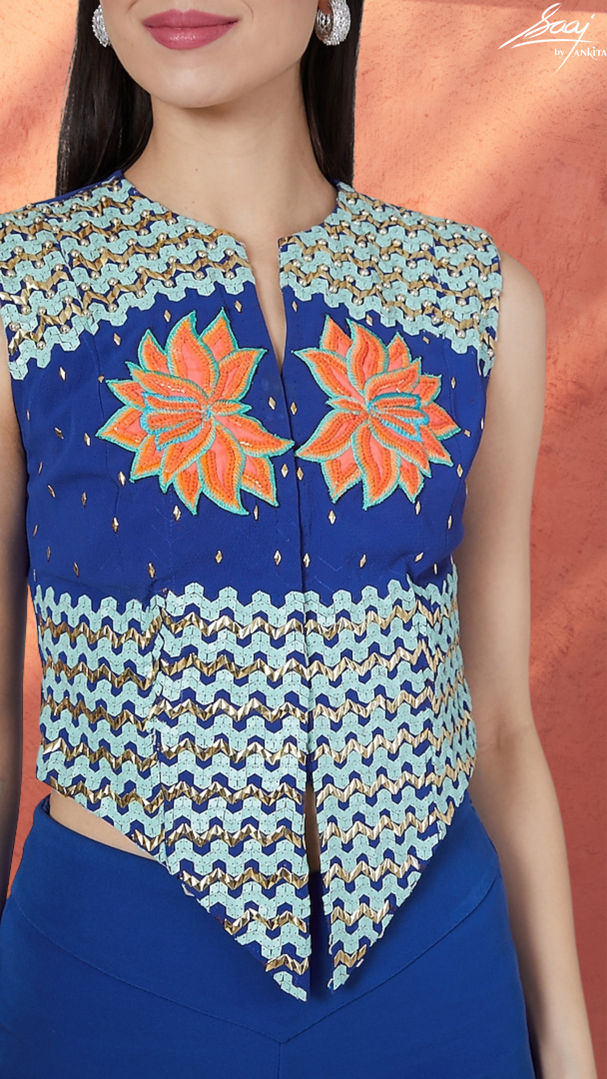 Embroidery Details – Applique embroidery is used to create the lotus and is highlighted with sequin and beads to enhance the overall-look. The chevron motif is created using geometric cut sequin and metal finish embroidery material.